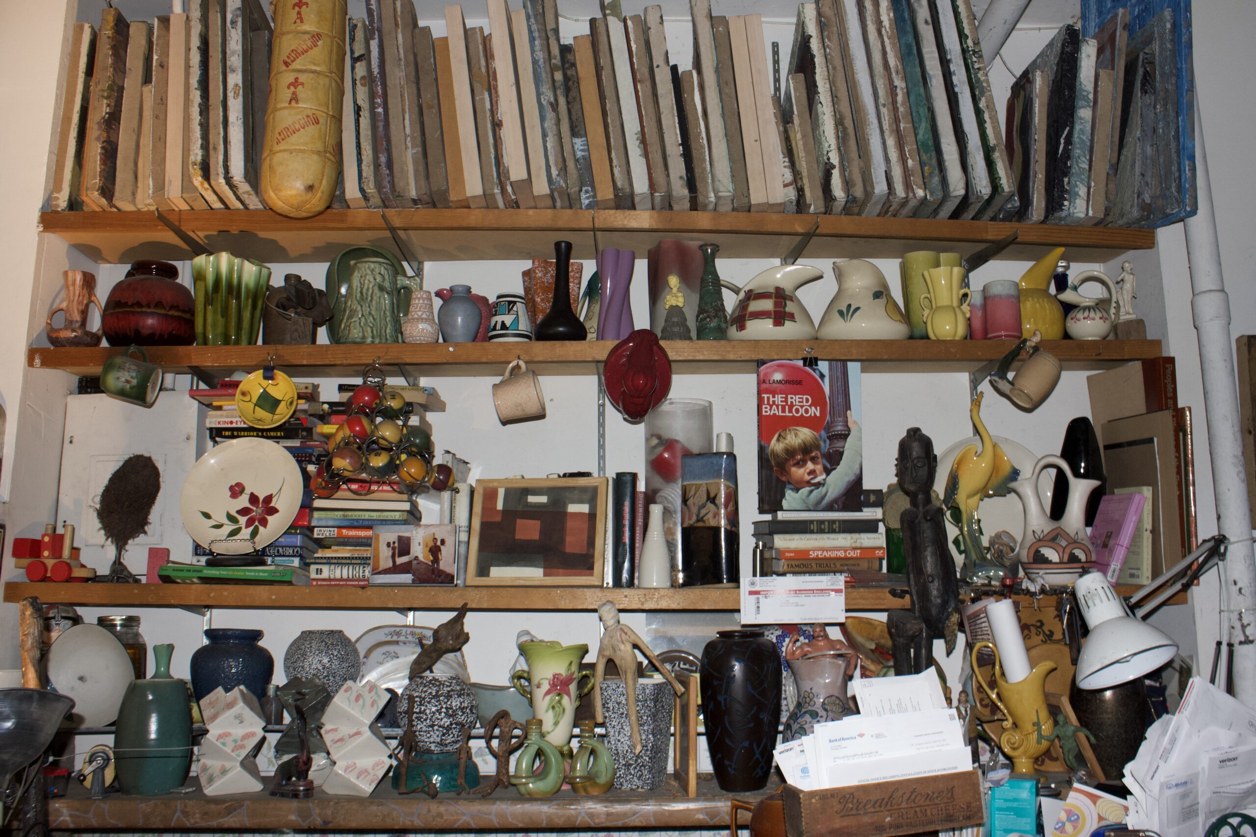 Footer Image: One of Mark’s many shelves of canvases and precious items.
